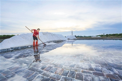 东方盐场,一位盐工在收盐。海南日报全媒体记者 陈元才 摄