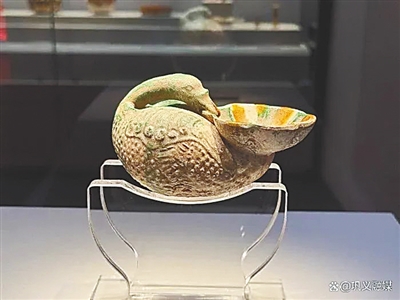来自河南巩义市博物馆的唐三彩鸭衔梅花杯。