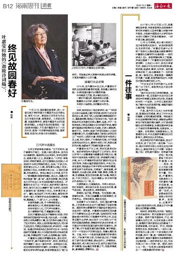 ■ 明斋11月24日,国际著名教育家、诗人、中国古典文学研究泰斗叶嘉莹先生在天津仙逝,享年100岁。想起自己多年来与先生在文字里的交集,感慨颇多。几年前去西藏,我随身携带的,便是叶嘉莹先生的《迦陵诗词稿》。从阅读中我深切感受到,一部《迦陵诗词稿》,不仅是叶嘉莹先生个人的成长史,更是一代华裔学者励志自强、爱家爱国、自呈丹心的奋斗史与奉献史。