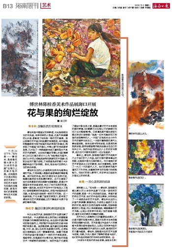 ■ 阮江华11月24日下午,“花与果——傅世林、陈桂香伉俪从教从艺50余年作品展”在海口上邦美术馆开展。这场展览不仅是对两位老艺术家半个世纪艺术探索与实践的深情回顾,更是对他们的奉献精神与艺术成就的致敬。
