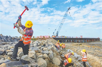 12月2日,在临高金牌港开发区港口及配套工程项目施工现场,工程有序推进,施工场面热火朝天,目前该项目除引桥段外,一期护岸工程基槽开挖和堤心石回填已全部完成。据介绍,金牌港开发区港口及配套工程项目,是省委、省政府高度关注的自贸港重点项目,分3期建设。项目一期工程新建长约11.128公里的疏港快速路和2个7万吨级通用泊位,新建泊位总长531米,年设计吞吐量700万吨;二期工程新建3个2万吨级通用泊位,新建泊位总长度558米,年设计吞吐量600万吨;三期工程新建2个2万吨级通用泊位,新建泊位总长度372米,年设计吞吐量300万吨。