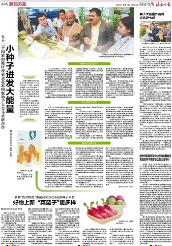 看着展台内不断涌入的全球客商,北京捷利亚种业有限公司董事长张全杰不断电话“找人”前来支援。“我们定位全球育种,形成以十字花科为优势、以葫芦科为增长点、以百合科和茄科为潜力品类的科研梯队,这次特地带了近70个新品种参展。”张全杰感叹道,收获超过预期,全球客商对于中国高品质的种子表现出浓厚兴趣,大会为好种子从海南出海搭建平台。