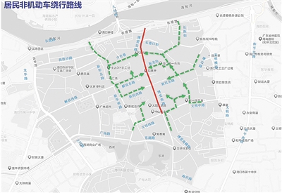 博爱路(长堤路至解放东路路段)限行后,该片区居民骑非机动车可往东西两侧绕行,也就是经长振街、文明中路绕行,或由新华北路、新华南路绕行。沿线相交道路均有路可通,周边居民停车维持现状。另外,相关单位在附近片区就近新增了4个电动车停放点,分别为:骑楼第三停车场、解放东路口、振龙坊和毓秀坊。居民可将非机动车停放在指定点位。
