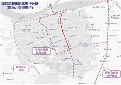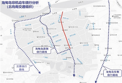海甸岛的非机动车辆由北向南方向,可经西侧的新华北路、龙华路绕行,或东侧的和平路绕行。由南向北方向,可以从新华北路、长堤路、龙华路绕行,或经和平路绕行。