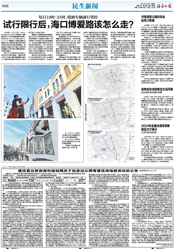 本报海口12月3日讯 (海南日报全媒体记者习霁鸿)根据海口骑楼建筑历史文化街区博爱路保护修缮工程方案,自12月1日0时起,每日10:00-24:00,博爱路(长堤路至解放东路路段)试行限制通行管控,期间限制非机动车和机动车通过管控路段。根据前期交通限行试行情况,将适时启动博爱路(文明中路口到解放路路段)交通限行管控。限行后,市民游客该如何绕行?电动车可以停放在哪里?远期相关部门单位又将通过哪些措施缓解交通压力?海南日报全媒体记者采访了相关部门单位,对此进行盘点。