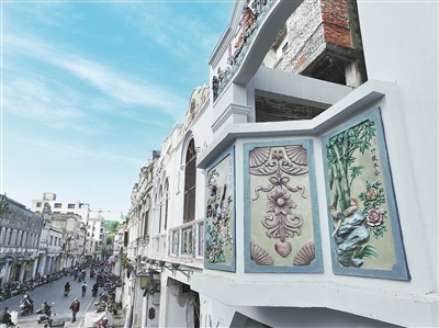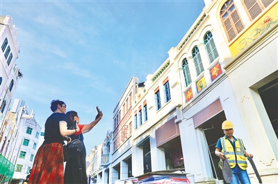12月3日,游客打卡修缮中的海口骑楼建筑历史文化街区博爱路楼房。