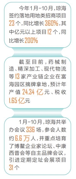 在富海产业园,这样的“大块头”“重量级”的项目越来越多。数据显示,今年1月-10月,琼海签约落地亿元以上项目12个,同比增长200%;截至目前,药械制造、精深加工、现代物流等13家产业链企业在富海园区摘牌拿地,预计年产值24.34亿元、税收1.65亿元。