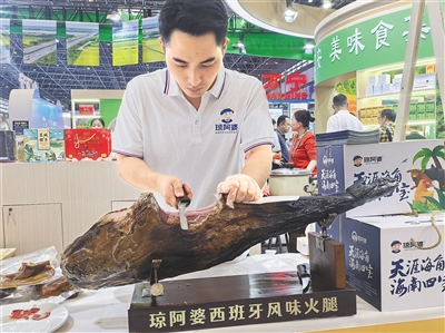 于是,打造定安黑猪、定安小黄牛等卤制品产品,借助过去在食品加工行业的经验及技术优势,张永新琢磨起了用定安黑猪研发西班牙风味火腿,首批实验10条。“现在已经实验成功,目前正在筹备在定安落地火腿加工厂,预计明年年底能开始批量生产。”张永新说,展销第一天,就有4位有代工意向的合作方与他洽谈。