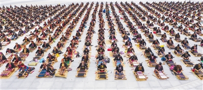 在东方市文化广场,千名群众共织黎锦。(资料图)