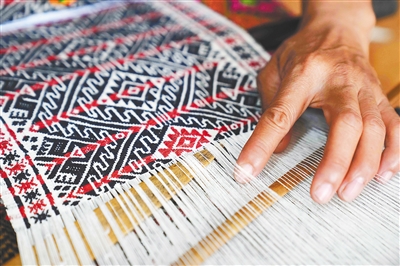 在织娘灵巧的手下,一根根纱线慢慢织成精美的黎锦。海南日报全媒体记者 陈元才 摄