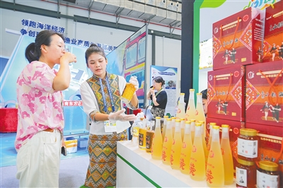 ① 12月6日,冬交会乐东展馆,非遗技艺酿造的山兰酒吸引市民前来品尝。