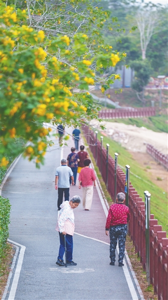 保亭合口桥口袋公园一旁的步道花开烂漫,市民悠然自得漫步其间。