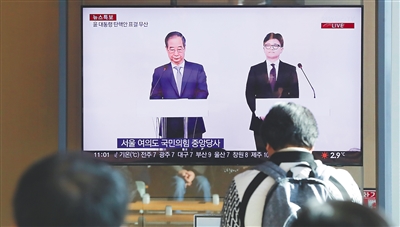 十二月八日,民众观看韩国执政党党首韩东勋与国务总理韩德洙(左)共同会见记者的电视直播。新华社发