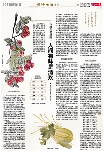 ■ 海南日报全媒体记者 宋灵云文人以笔表达的清雅世界似乎离口腹之欲很遥远,苏轼却从不羞于表达对美食、对果蔬的热爱。饱满鲜红的荔枝,临水疯长的蒌蒿,破土而出的韭菜,青翠鲜嫩的荠菜……宦海几度沉浮,他不执着于锦衣玉食的生活,而是保持“也无风雨也无晴”的心态,珍藏一份对世间万物的好奇心,在寻常瓜果蔬菜中寻找悠闲自适的精神体验,终悟得“人间有味是清欢”。