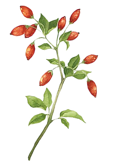 苏东坡对枸杞情有独钟,无论是在生活中还是在诗词里,都经常提到它。《小圃五咏·枸杞》中云:“神药不自閟,罗生满山泽。”诗歌开篇就将枸杞称为“神药”,肯定了枸杞的药用价值。“日有牛羊忧,岁有野火厄。越俗不好事,过眼等茨棘。青荑春自长,绛珠烂莫摘。”枸杞漫山遍野地生长,要历经牛羊的啃食和野火的焚烧,但它生命力顽强,能茁壮成长并结出烂漫的红果实。而且枸杞的根茎花实皆可入药或食用:“根茎与花实,收拾无弃物。”食用后可达到防病治病的效果:“仙人倘许我,借杖扶衰疾。”此诗在肯定枸杞药用价值的同时,用诗歌的语言赞颂了枸杞灼灼的生命力。