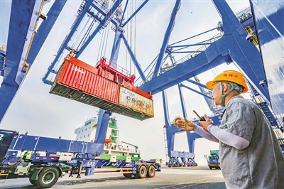在洋浦经济开发区国际集装箱码头,工人指挥集装箱装船。
