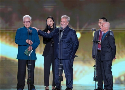 ②12月10日,在电影节闭幕式上,吕克·贝松(中)为获奖者颁发最佳影片奖。海南日报全媒体记者 李天平 摄
