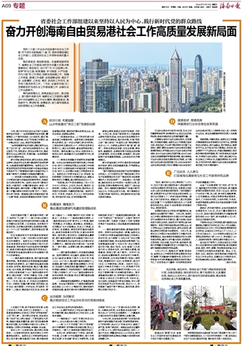 “提升两新组织党组织班子成员和管理层双向进入、交叉任职的比例”“推进党建工作与生产经营管理双向互动”“推进党员与经营管理技术人员双向培养”……我省通过一系列措施,推动党员在生产和项目一线勇打头阵、攻坚克难,发挥先锋模范作用,涌现了一批先进典型。其中,海南航空集团践行“党建为魂”的企业文化,引领企业扭亏为盈。海口滴滴成立“红旗方向盘”党员车队,使红旗网约车成为城市亮丽风景线。
