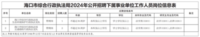 为贯彻落实省委、省政府“聚四方之才 共建自贸港”工作部署,围绕“椰城优才 智汇海口”招才引智活动,切实加强全市综合行政执法队伍力量建设。海口市综合行政执法局面向社会招聘下属公益一类事业单位海口市综合行政执法局生态环境保护行政执法支队、海口市综合行政执法局交通港航行政执法支队事业编制人员。请登录海口市综合行政执法局网站查看招聘详情。报名方式: