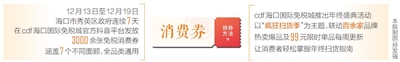 本报海口12月13日讯 (海南日报全媒体记者曹马志 通讯员谢玮)海南日报全媒体记者从中免集团获悉,为充分释放免税消费潜力,12月13日,海口市商务局、海口市秀英区政府联动,再次启动“嗨购秀英,乐享免税”专项活动,发放新一轮免税消费券560万元,旨在打好年终免税消费的“收官之战”。12月13日至12月19日,海口市秀英区政府连续7天在cdf海口国际免税城官方抖音平台发放3000余张免税消费券,涵盖7个不同面额,全品类通用。