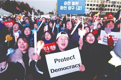 12月14日,在韩国首都首尔,人们在国会外庆祝弹劾动议案表决通过。新华社发