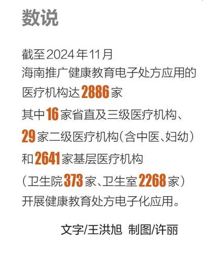 近年来,海南大力推进健康教育电子处方应用,从2022年开始在3家医院试点推广应用,将健康教育处方嵌入医院HIS系统,在医生开展诊疗和患者出院时,为患者出具“一病两方”:药物治疗处方和健康教育处方。截至2024年11月,海南已推进全省2886家一、二、三级医疗机构和基层医疗机构健康教育电子处方应用全覆盖。