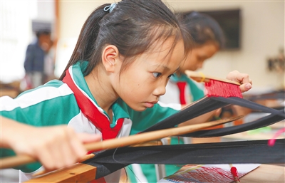 白沙黎族自治县龙江中心学校学生在练习黎锦织锦技艺。