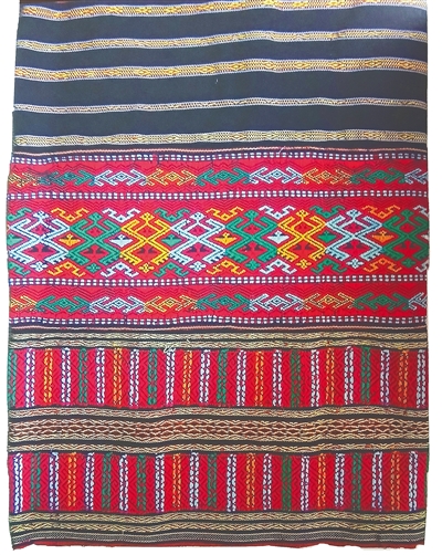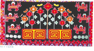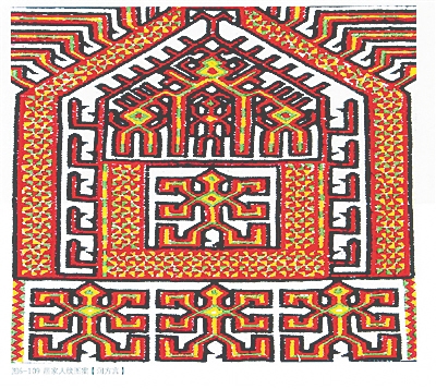 赛方言区黎锦纹样也较为瑰丽复杂,与杞方言区有许多相似之处。纹样多为人形纹、蛙纹和植物纹,部分赛方言区黎族妇女的筒裙上,也有在纹样中嵌入云母片或蚌壳的织绣方法。