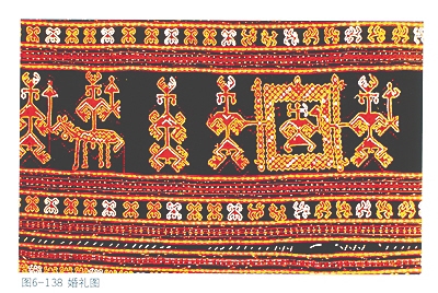 哈方言区黎锦纹样类型丰富,常见的有人形纹、居家双人纹、蛙姿人形纹、盛装人形纹、龟纹等,裙身、裙尾花纹比较精美。哈方言区的织绣水平非常高,代表作有“婚礼图”“耕耘图”及龙被等。“婚礼图”是三亚鹿回头一带的传统婚服,真实记录了当地传统婚俗,整个画面分为“迎娶”“送娘”“送礼”三部分。在“迎娶”画面中,花轿前面有德高望重的长者引路,新娘居中,抬轿人在两侧依次排开,随行的伴娘亦动感十足,迎亲队伍盛装出行,前后呼应,恰如其分地表现出婚礼的欢快气氛,颇具艺术性和趣味性。无论从史料价值还是艺术价值来看,“婚礼图”都堪称黎锦中的瑰宝。在“耕耘图”中,有双人骑牛相斗、耕牛犁田等画面,亦十分生动有趣。