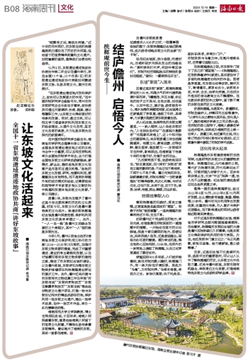 今年5月,儋州以我省出台的《海南省东坡文化保护利用三年行动方案(2024—2026年)》为契机,加强对东坡文物资源的普查,完成了对重要遗迹、遗址的考古勘探和发掘,以及对馆藏可移动东坡文物资源的建档立案,推进了苏东坡纪念馆的建设,以及儋州故城、东坡诗石刻等东坡文物保护修缮项目和桄榔庵遗址原址的展示工作。此外,儋州还将开展与苏东坡有关文物征集工作及申报“苏东坡传说”“东坡肉烹制技艺”“东坡玉糁羹烹制技艺”“东坡生蚝”等各级非物质文化遗产项目,打造一批与东坡印记相关的精品旅游目的地,保护利用一批东坡文化遗产,推出一批学术成果、创作一批艺术作品、举办一系列赛事活动等。
