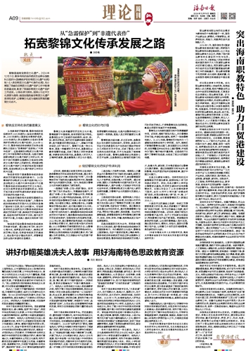 ■ 刘冬梅黎锦是海南宝贵的文化遗产。2024年12月5日,黎族传统纺染织绣技艺由联合国教科文组织从《急需保护的非物质文化遗产名录》转入《人类非物质文化遗产代表作名录》,充分展现了我省在非物质文化遗产保护工作中取得的显著成效,彰显了我国非物质文化遗产保护工作成效。以转名录为契机,坚持以习近平文化思想为指导,继续加强我省非物质文化遗产系统性保护,让黎锦文化成为海南自贸港的靓丽文化名片。