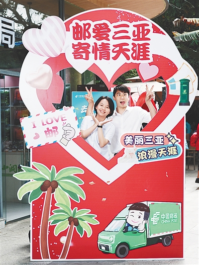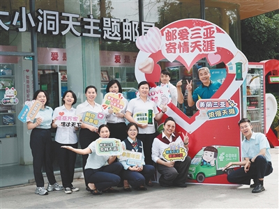 ③ 中国邮政的工作人员在三亚大小洞天主题邮局前留下幸福的纪念照。
