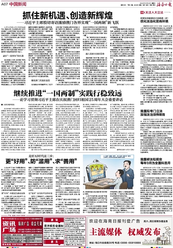 《澳门日报》20日发表社论指出,澳门回归祖国后的巨变充分证明,“一国两制”完全行得通、办得到、得人心。“一国两制”是我国一个伟大创举,凝结了海纳百川、有容乃大的中国智慧,是中国为国际社会解决类似问题提供的一个新思路、新方案,是中华民族对世界和平与发展的新贡献。
