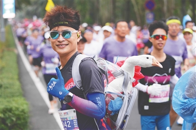 跑者背琼海温泉鹅参加欢乐跑。
