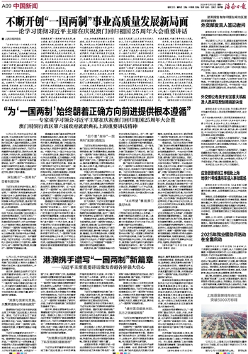 “当前和今后一个时期是以中国式现代化全面推进强国建设、民族复兴伟业的关键时期,‘一国两制’实践也进入了新阶段。”在庆祝澳门回归祖国25周年大会暨澳门特别行政区第六届政府就职典礼上,习近平主席对新一届澳门特别行政区政府提出了“四个着力”的希望,蕴含着对澳门发展的深邃思考、对澳门同胞的亲切关怀,为不断开创“一国两制”事业高质量发展新局面提供了方向和行动指引。