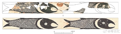 山西运城崔家河遗址出土的彩陶鱼纹盆上的鱼纹(上)及复原图(下)。