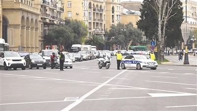 12月26日中午12时,在阿塞拜疆首都巴库,车辆停止行驶,为阿塞拜疆飞机失事遇难者默哀。新华社发