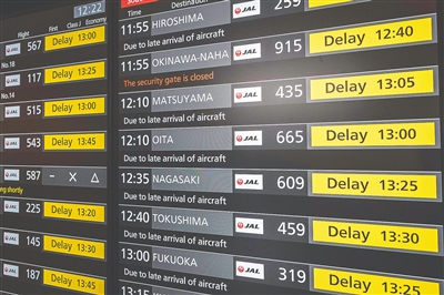 12月26日,在日本东京羽田机场,航班信息显示屏上显示日本航空公司的多个航班延误。