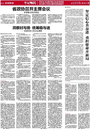 会议指出,要以重点带好全局,聚焦“三张清单”加强实战化演练,全力确保封关运作平稳有序、万无一失、首战必胜,加紧推进海南自由贸易港核心政策落地;全方位提振扩大内需,一方面发挥新型消费和传统消费“双轮驱动”效应,做好“三篇境外消费回流文章”,结合“两新”工作持续扩大大宗商品消费,另一方面做好项目谋划、储备和申报,推动项目开工能早则早,为投资进度按下“加速键”;全面深化改革、扩大开放,持续加大服务企业力度,扎实做好外资、外贸、外国人“三外”文章,努力创造更多具有全国示范力、影响力和自由贸易港辨识度的改革开放成果。