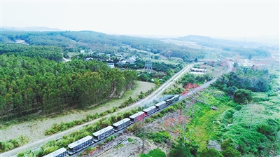 在昌江排岸村铁路木棉观景台,远眺石碌开往八所的火车穿过木棉花海。