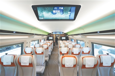 车厢内部可随室外环境自动调节亮度;每个座位都提供USB等充电设施;可提供多功能间、家庭包间、商务包间等多样选择……CR450动车组让旅途更舒适。