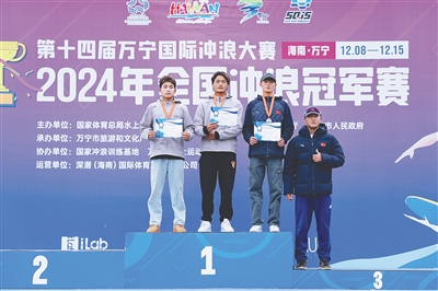 海南冲浪队队员王成征(左二)和队友刘琛(左一)共同登上领奖台。