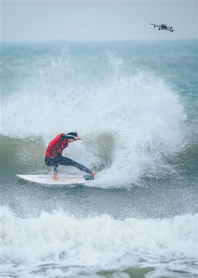 海浪迎面而来,他起身站在冲浪板上,从浪底弹起直冲浪口,靠身体旋转发力,后腿蹬出,急速转弯“掉头”,在接近浪顶的位置撕出了一道漂亮的水花。