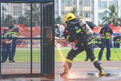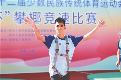 这是发生在第十二届全国少数民族传统体育运动会(以下简称运动会)攀椰竞速男子组决赛上的一幕。现场,三亚市消防救援支队消防员罗军右脚在树上奋力一蹬,双手双脚同时发力,稳稳踩住树干,跳跃攀爬,飞身拍铃,最终以“6.188秒”的成绩获得攀椰竞速项目男子9米决赛一等奖。