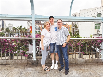 杰里德(中)与父母在海口一中天桥上合影留念。