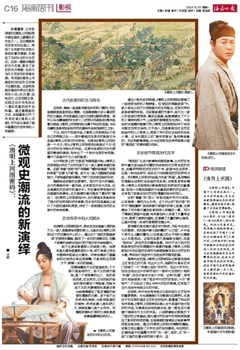 ■ 汪荣毋庸置疑,北宋张择端的《清明上河图》是中国绘画史上最著名的作品之一。在这幅具有写实性的风俗画上,再现了北宋都市东京街头巷陌的繁华景象,也描绘了当时社会的众生百态。这样一幅复杂精细的古代名画,激发了后世的无尽想象,也成为当代文艺创作的灵感来源。电视剧《清明上河图密码》的创作正发端于这幅名画。这部电视剧改编自作家冶文彪的同名小说,共26集,由张颂文、白百何等主演,近期正在中央电视台八套和优酷网络平台热播。通过悬疑剧的方式,该剧重新打开了传奇名画《清明上河图》,并为观众演绎了画中蕴藏的历史传奇和人性幽微。