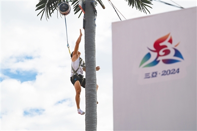 第十二届全国少数民族传统体育运动会攀椰竞速项目比赛现场。
