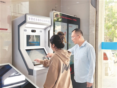 工作人员指导群众使用智慧政务服务自助终端办理业务。