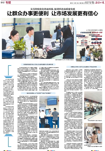 好的营商环境就像阳光、水和空气,既体现着经济发展“软实力”,也为各类经营主体发展提供“硬支撑”,优化营商环境更是一项永不竣工的工程。为此,文昌市始终把优化营商环境作为“一号工程”来抓,解放思想,真抓实干,紧紧围绕企业服务、政务服务、数据共享和信用建设等重点任务,以打造一流营商环境为总体目标,合力打出一系列改革创新、优化服务、数字赋能的“组合拳”,持续推进一流营商环境建设。
