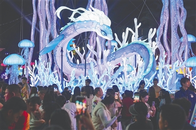 随着夜幕的降临,海南海洋欢乐世界度假区内灯光璀璨,人潮涌动。音乐声、欢笑声、烟花声,构成了一幅温馨而又热闹的画面。当天,该度假区的门票全部售罄。人群聚集在园区的广场上,看绚丽的烟花升空。